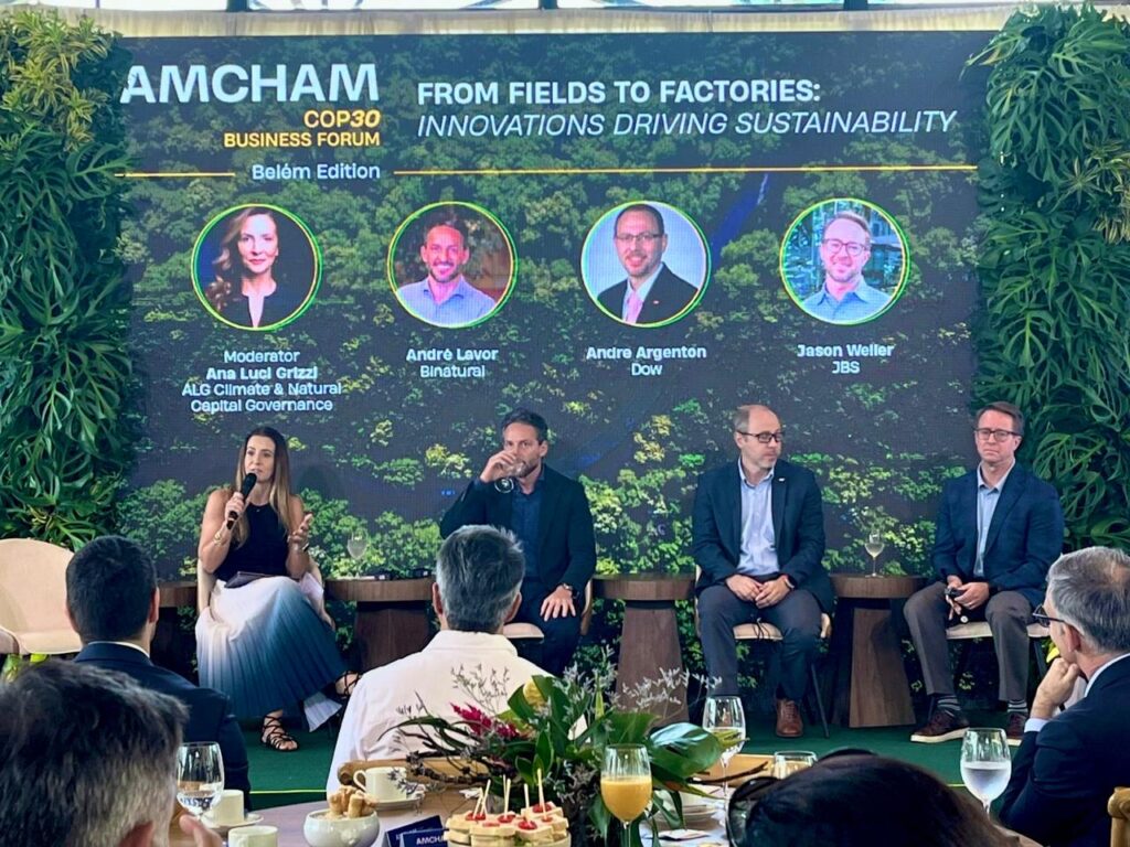 Neste evento durante a COP30, AnaLu moderou painel sobre como os setores industriais estão alavancando a inovação para alcançar metas de descarbonização. A discussão destacou o papel estratégico dos biocombustíveis, da química circular, da agricultura regenerativa e da tecnologia no desenvolvimento de soluções climáticas escaláveis e economicamente viáveis.